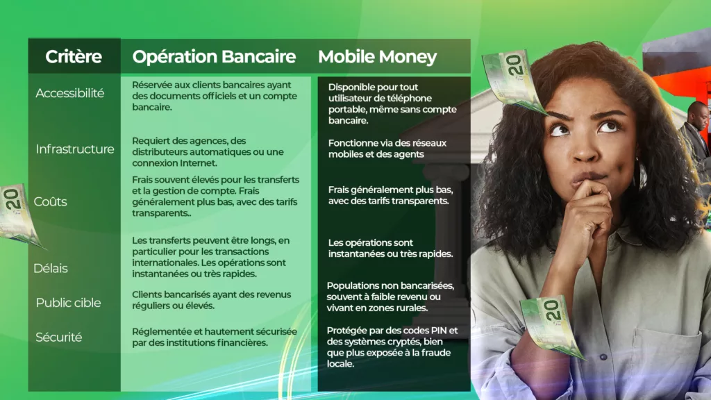 Bien que les opérations bancaires classiques offrent des services sophistiqués et une sécurité optimale, le Mobile Money répond à des besoins immédiats et accessibles à tous. Il joue un rôle essentiel dans la réduction des inégalités financières en permettant aux populations les plus vulnérables d’effectuer des transactions simples et abordables.